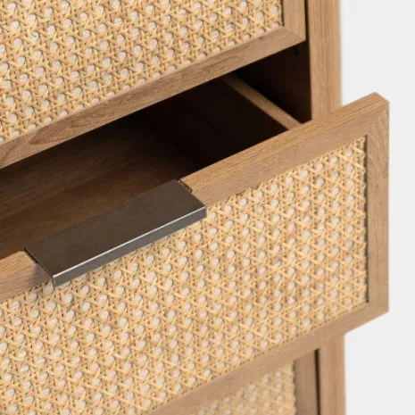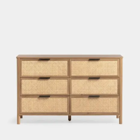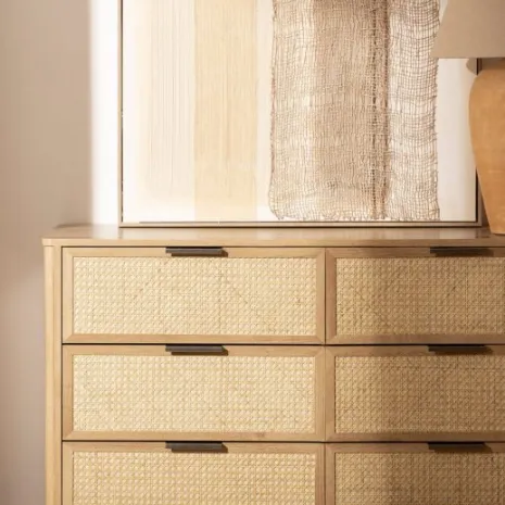 Convierte tu dormitorio en un lugar tranquilo y acogedor con la cómoda Bent. Presenta un acabado en madera natural con sofisticados detalles de ratán natural. Su armonía de texturas brinda calidez y estilo orgánico, convirtiéndola en una pieza única que aporta serenidad a tu espacio personal. Cuenta con seis amplios cajones para que puedas mantener ordenada tu ropa, accesorios y objetos personales. Descubre el resto de la colección Bent y consigue un ambiente natural y contemporáneo para tu hogar.