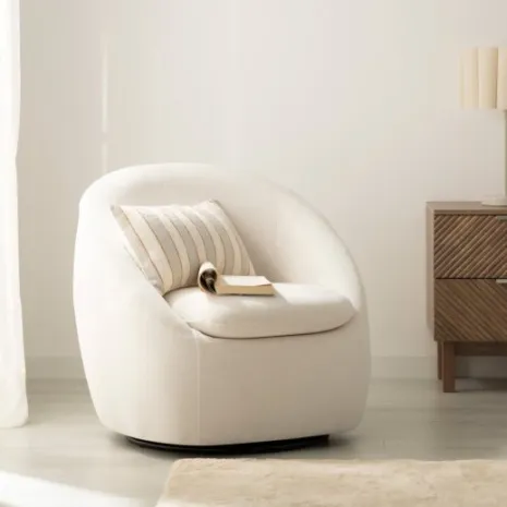 La butaca giratoria Odd tapizada en color beige encaja perfectamente en cualquier ambiente. Su amplio respaldo y el cojín del asiento proporcionan una comodidad excepcional, mientras que su función giratoria la convierte en una pieza tremendamente versátil. Esta butaca combina elegancia y funcionalidad, creando el rincón perfecto para disfrutar de los momentos de relax en tu hogar.