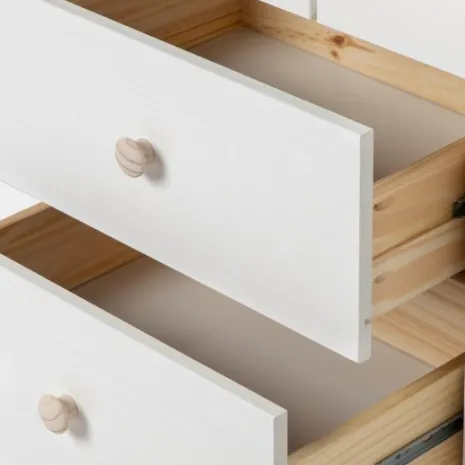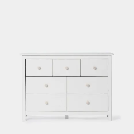 Mantén la habitación de tu pequeño siempre ordenada con la cómoda infantil de 7 cajones Eloise. Su acabado lacado en blanco y su diseño atemporal la convierten en la opción perfecta para hacer de cualquier dormitorio un espacio más acogedor y encantador. Sus amplios cajones son ideales para guardar toda su ropa, juguetes y accesorios. Además, incluye dos tipos de tiradores para que elijas el estilo que mejor se adapte a su habitación.