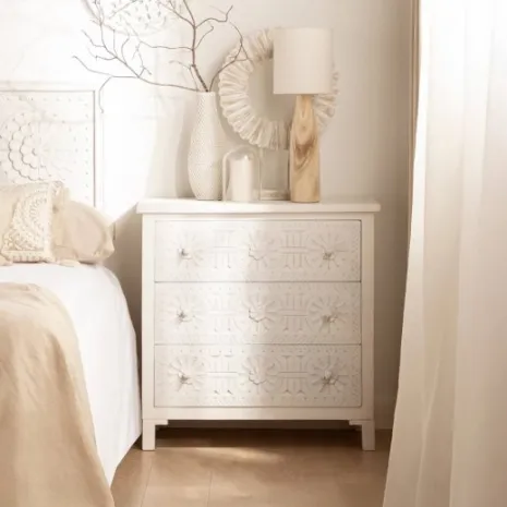La cómoda en blanco vintage Iraya aportará estilo y personalidad a tu dormitorio. Sus tres cajones de gran capacidad te ayudarán a organizar y almacenar todas tus pertenencias. Para mayor estabilidad del mueble, aconsejamos su anclaje a la pared. Combínalo con el resto de la colección y consigue el look completo.