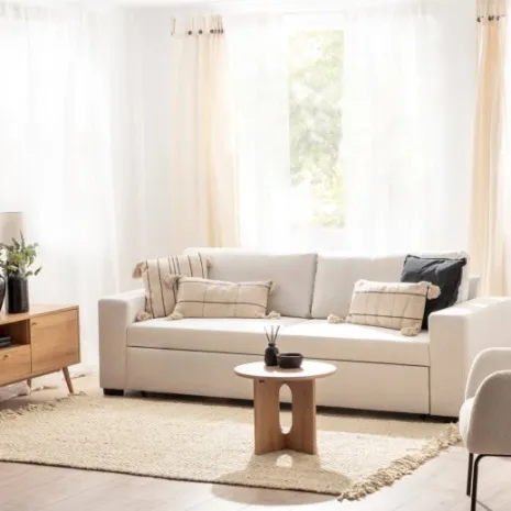 El sofá cama de 3 plazas en color beige Meryl es la combinación perfecta de estilo y funcionalidad. Este sofá no solo añade un toque de sofisticación a tu salón, sino que también ofrece una versatilidad incomparable gracias a su diseño convertible. En un abrir y cerrar de ojos, podrás transformar el sofá en una cama espaciosa, brindando una solución práctica y acogedora para alojar a tus invitados.