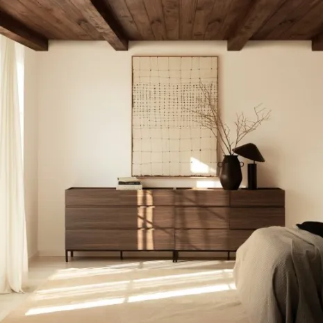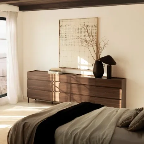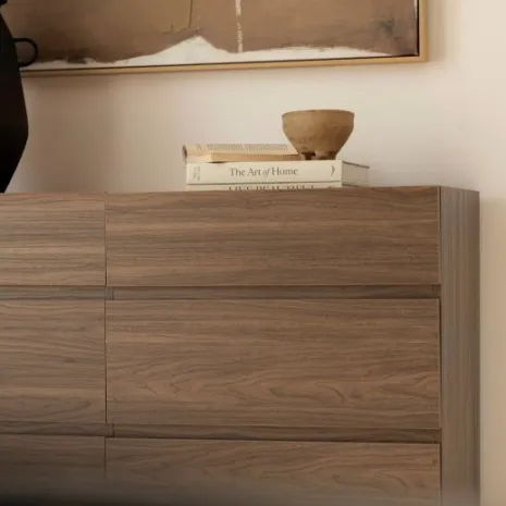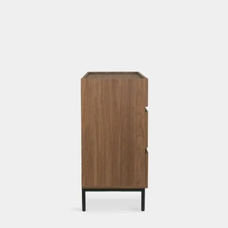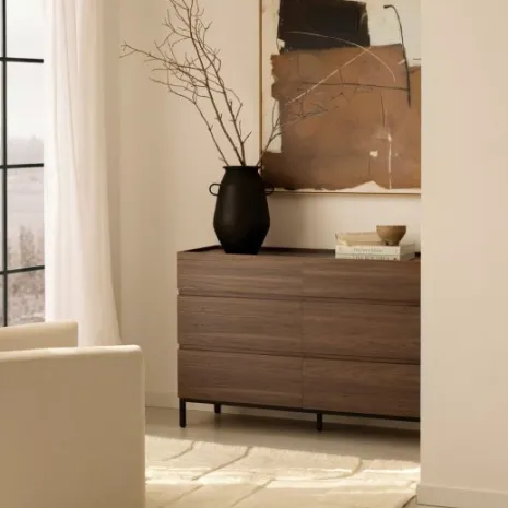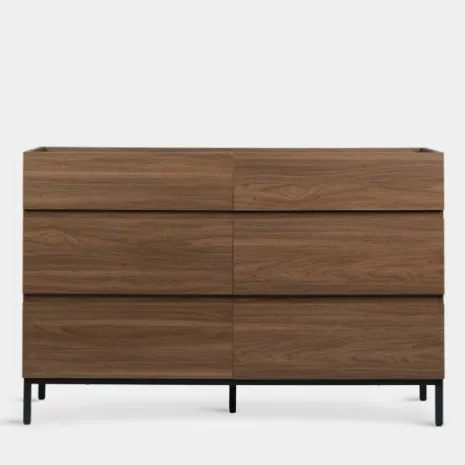 Transforma tu dormitorio con la cómoda Peyton, que presenta un acabado en madera color nogal con unas estilizadas patas metálicas negras. Su estilo moderno y minimalista brinda sofisticación y carácter a tu espacio de descanso. Cuenta con seis amplios cajones que ofrecen almacenamiento práctico y ordenado para tu ropa, accesorios y objetos personales. Explora el resto de la colección Peyton y desarrolla un ambiente único y contemporáneo para tu hogar.