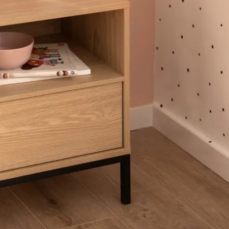 Dale un toque de elegancia y funcionalidad al dormitorio de tu pequeño con la mesita de noche Remi. Su estante superior y su amplio cajón ofrecen un espacio de almacenamiento práctico y discreto, ideal para mantener todas sus pertenencias organizadas. Combínala con el resto de la colección y crea un ambiente acogedor, encantador y siempre en orden.