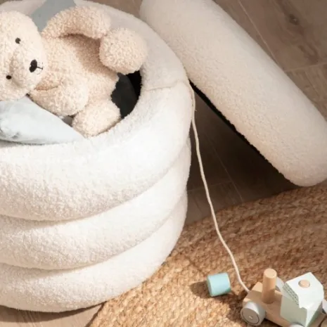 Crea un ambiente acogedor en la habitación de tu peque con el puf redondo Roma tapizado en borreguito blanco, un tejido que aporta suavidad y calidez. Además, cuenta con práctico espacio de almacenaje en su interior, perfecto para guardar sus juguetes, mantas o cuentos y mantener su cuarto siempre recogido. Con Roma, disfrutarás de comodidad y funcionalidad en un diseño actual que le encantará.