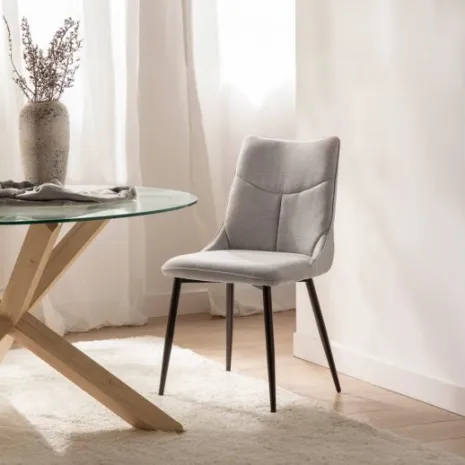 La silla de comedor Selma es la opción ideal para realzar la elegancia y comodidad en tu hogar. Con un tapizado en tono gris suave y patas negras, ofrece un estilo atemporal que se adapta sin esfuerzo a cualquier ambiente.