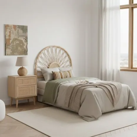 Dale un toque natural y fresco a tu dormitorio con el cabecero Fera. Fabricado artesanalmente en ratán natural, esta pieza añade calidez y autenticidad a tu hogar. Se puede utilizar en camas de 80 y 90 cm. Requiere anclaje a la pared.