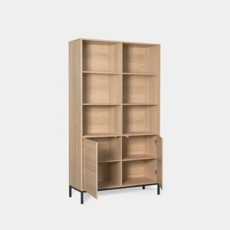 Transforma cualquier espacio de tu hogar con la estantería alta Remi, acabada en madera color natural y patas metálicas negras. Sus puertas y estantes ofrecen un amplio espacio de almacenamiento para organizar todos tus libros, objetos personales y accesorios de forma ordenada, manteniendo algunos elementos a la vista y otros guardados. Combínala con otras piezas de la colección para crear un ambiente elegante y práctico.