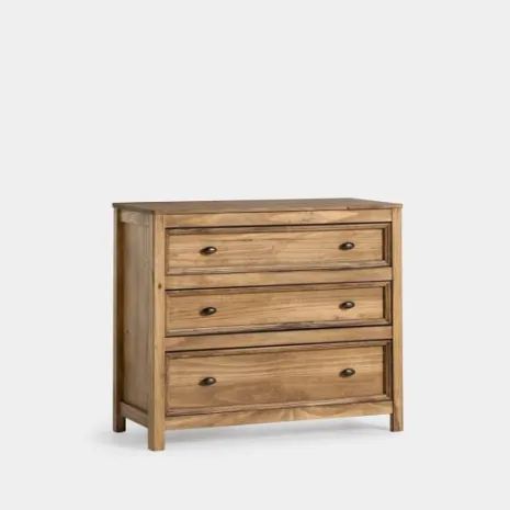 La cómoda Serena, fabricada en madera de araucaria con acabado en color natural, es la elección ideal para añadir un toque extra de almacenamiento al cuarto de los niños. Su diseño de 3 cajones combina funcionalidad con un estilo rústico y auténtico que se refleja en cada detalle. Al estar fabricada con madera natural, pueden apreciarse variaciones en el color y la textura.
