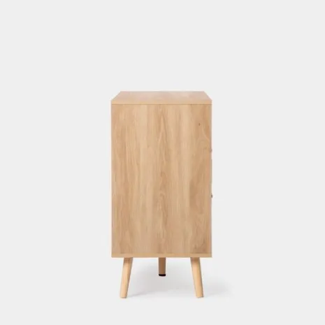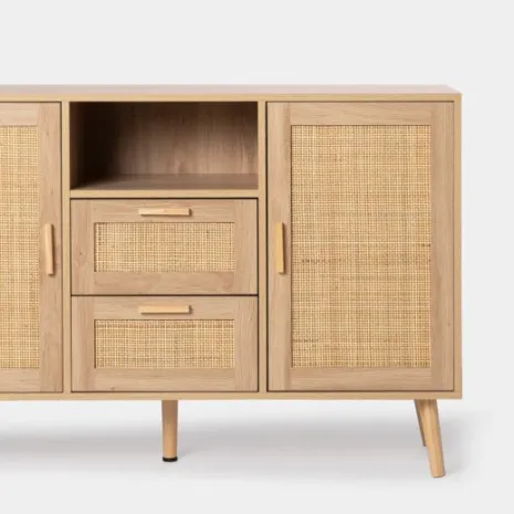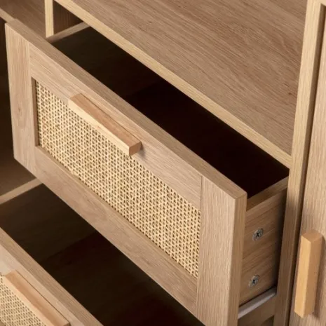 Consigue un plus de almacenamiento y estilo con el aparador en ratán natural Tahiti. Cuenta con dos puertas, dos cajones y un estante que permiten optimizar al máximo el espacio y mantener el orden en casa. Para mayor estabilidad del mueble, aconsejamos su anclaje a la pared. Combínalo con otras piezas de la colección y ¡consigue un efecto wow!