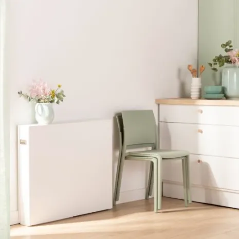 La mesa plegable rectangular blanca Anika es la mesa ideal para espacios pequeños, ya que cuenta con un sistema que permite aprovechar al máximo el espacio. Puedes tenerla totalmente plegada a modo de consola, a mitad desplegar a modo de mesa compacta para 3 personas o completamente abierta a modo de mesa para 6 personas. Incluye dos tiradores para facilitar su manipulación, pero si quieres una mesa más minimalista puedes optar por no colocarlos.