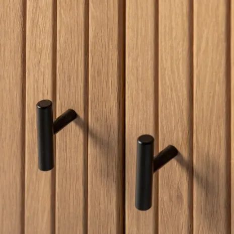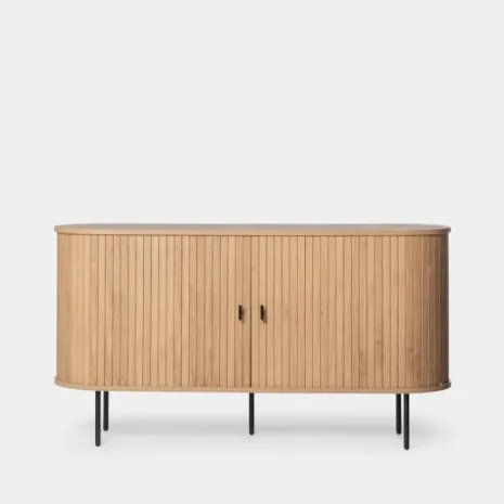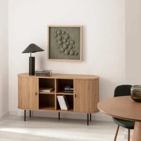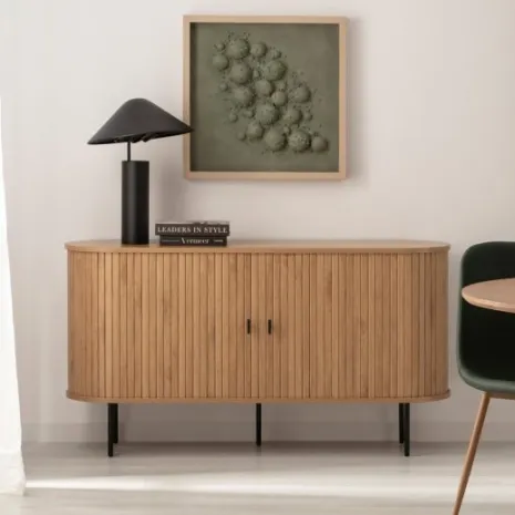 El aparador Breda en madera color natural, es la opción perfecta si buscas añadir un toque distintivo y moderno a tu salón. Su forma redondeada y sus dos puertas correderas de estilo persiana no pasan desapercibidas y además proporcionan un amplio espacio de almacenamiento. Combínalo con el mueble de TV Breda y consigue un look completo y moderno para tu hogar.