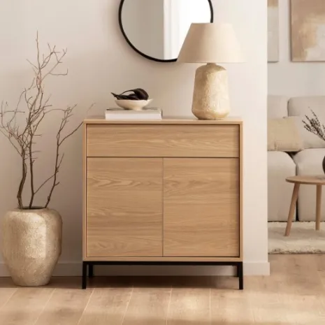 Añade estilo a tu entrada con el mueble recibidor en madera color natural Remi. Su cajón y dos puertas ofrecen una solución ideal para obtener almacenaje adicional en el salón, comedor u oficina. Completa la decoración de tu hogar con el resto de muebles de la colección y consigue un efecto wow.