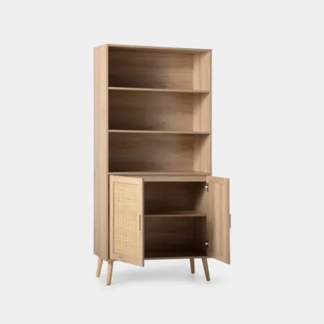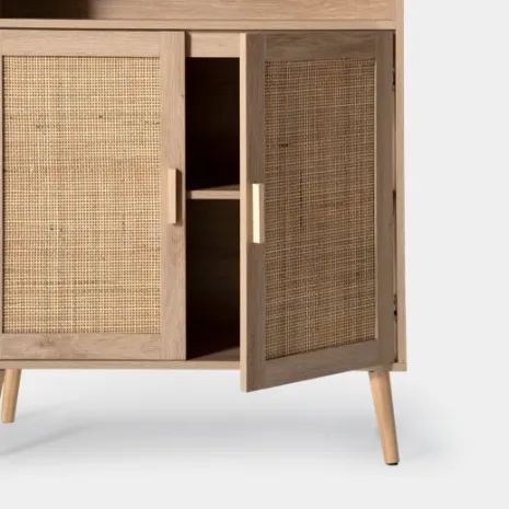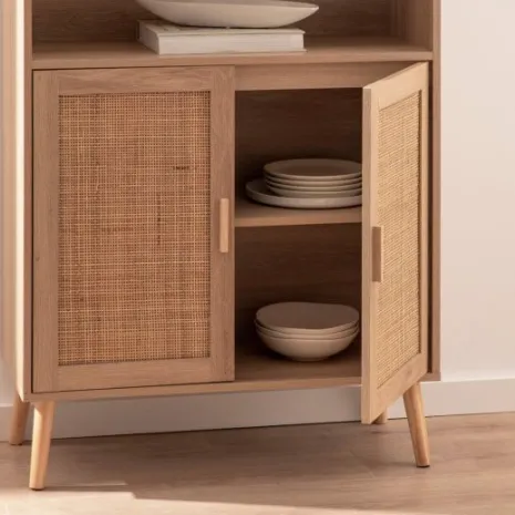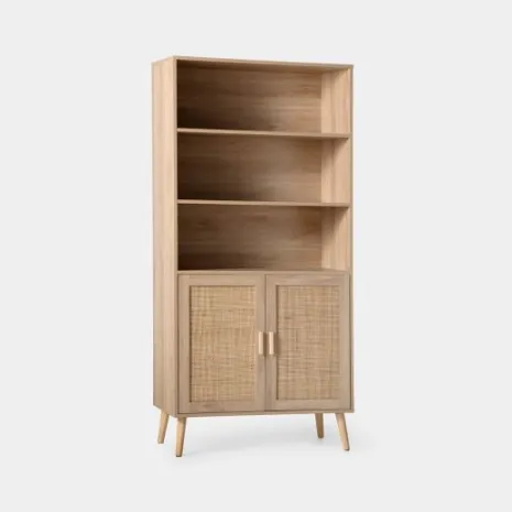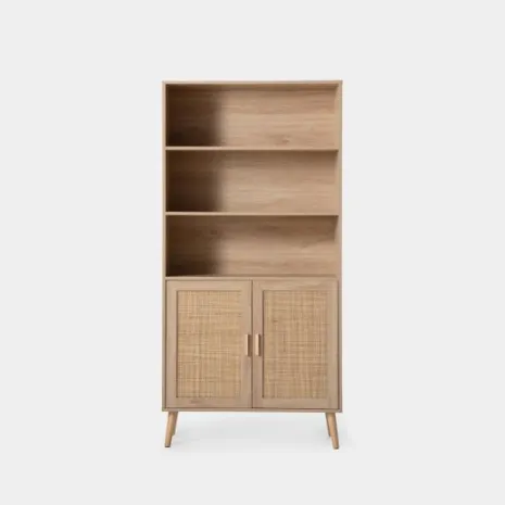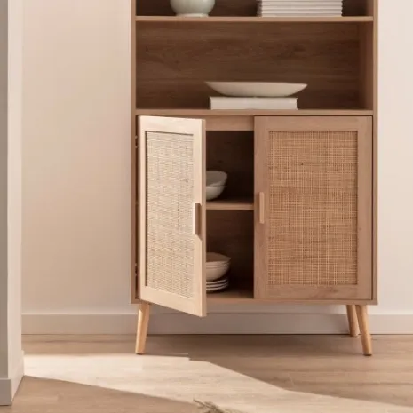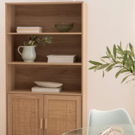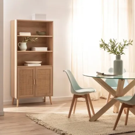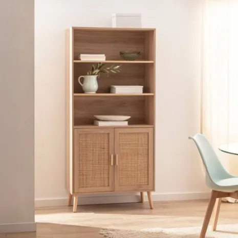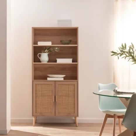 La estantería alta Tahiti combina madera de color natural y ratán natural, ofreciendo un diseño fresco y funcional. Su estructura estilizada y materiales orgánicos aportan calidez y ligereza visual, ideal para espacios que buscan un estilo natural y acogedor. Con amplios estantes, es perfecta para organizar y exhibir libros, plantas u objetos decorativos, añadiendo un toque de sofisticación a cualquier ambiente.