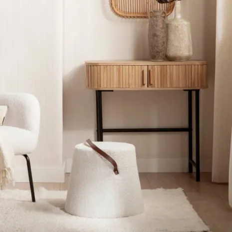 Dale un toque acogedor y moderno a tu hogar con el puf redondo tapizado en borreguito blanco Biko. El borreguito blanco da sensación de calidez y suavidad, mientras que su forma redonda añade un toque de originalidad a cualquier espacio. Ya sea como un lugar para descansar los pies o como asiento extra para invitados, Biko se adapta perfectamente a tus necesidades.