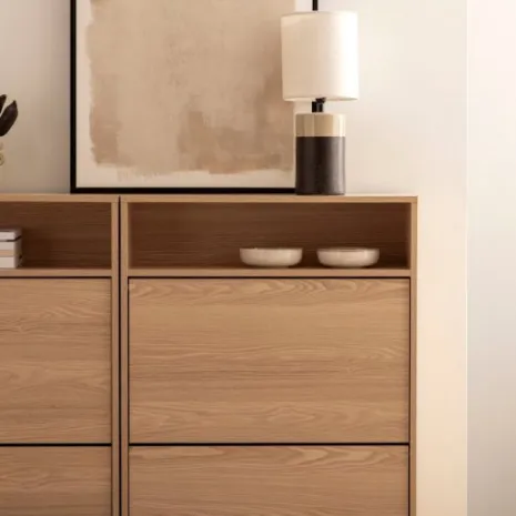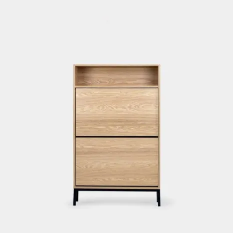 Organiza tus zapatos con estilo con el zapatero en madera color natural Remi. Sus dos puertas abatibles ofrecen una solución práctica y elegante para almacenar de forma organizada y práctica hasta 12 pares de zapatos. Además, cuenta con un separador extraíble, lo que te permite adaptar el espacio para guardar calzado de mayor volumen con facilidad. Para garantizar su estabilidad y seguridad, es imprescindible fijarlo a la pared.