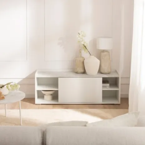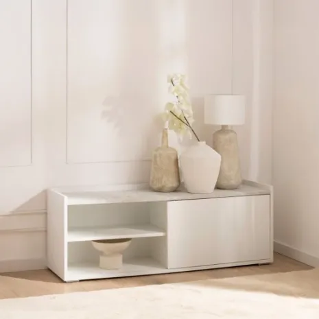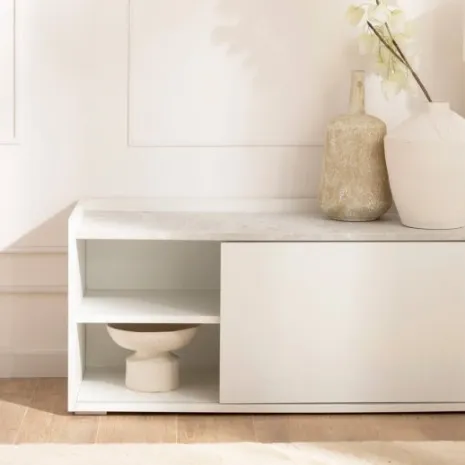 El mueble TV Siena es la elegancia en estado puro.Es una pieza de diseño propio creada por el equipo de Klast Home.De estilo nórdico este mueble dispone de una puerta corredera que permite jugar a ocultar aquello que quieras. Dispone de una balda interior para poder almacenar tus accesorios multimedia o libros, tiene mucha capacidad.Cuando hablamos de Siena, hablamos de diseño en mayúsculas, una de sus características más destacable, es su sobre con efecto marmolado, sin duda un detalle que derrocha estilo.Visita el resto de la colección y completa el look.