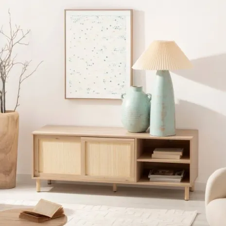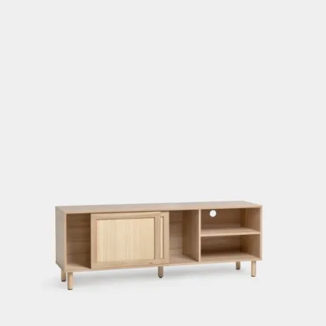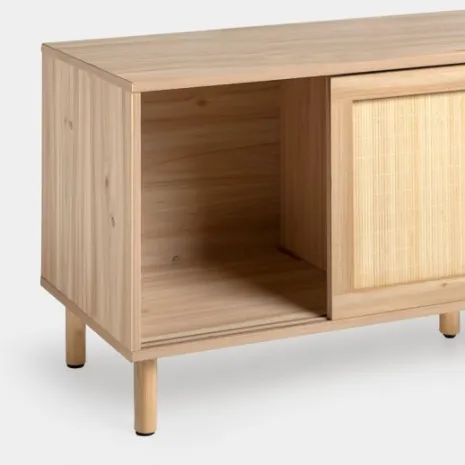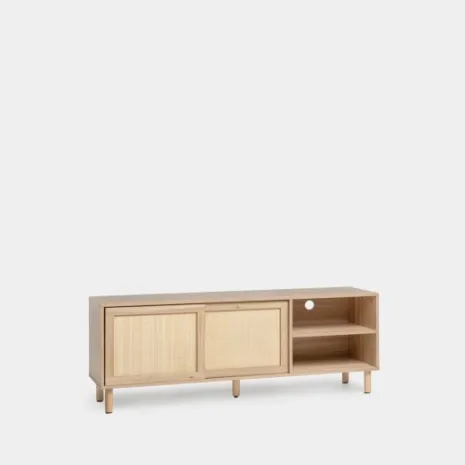Aporta personalidad y estilo a tu hogar con el mueble TV de 140 Timor. Acabado en madera y bambú natural, es perfecto para darle un toque original y acogedor a tu salón. Dispone de dos puertas correderas, dos estantes y un práctico orificio pasacables, ideal para organizar todos tus dispositivos y mantener el espacio siempre ordenado y a tu alcance. ¡Consigue una decoración armoniosa combinándolo con el resto de piezas de la colección!