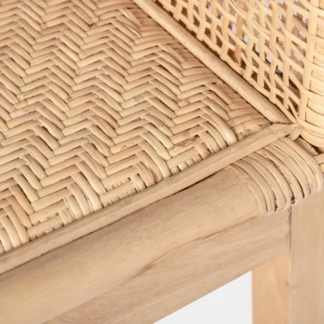 Con la silla Alen, aportarás un toque cálido y natural a tu comedor, salón o cocina. Fabricada con ratán natural y madera de mindi, esta silla destaca por su calidez y estilo natural. Cada silla es una pieza única, elaborada artesanalmente por expertos, por lo que puede presentar ligeras irregularidades propias de la naturaleza del material, que contribuyen a su encanto singular. Incluye un cojín desenfundable para mayor comodidad.