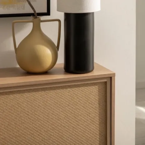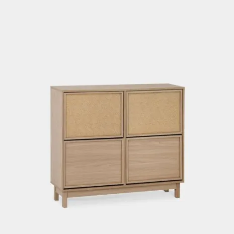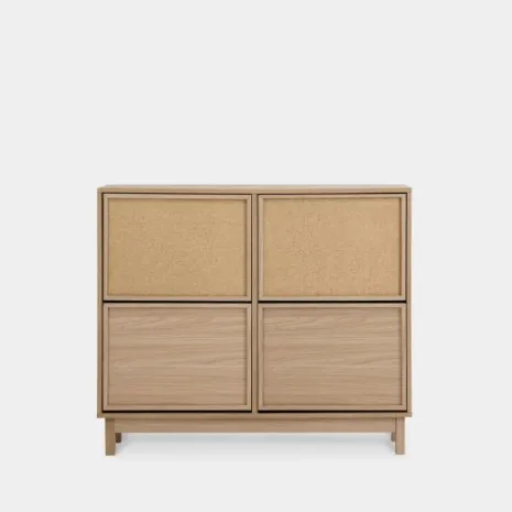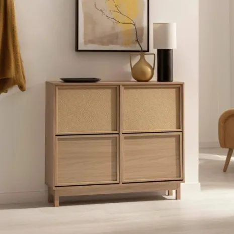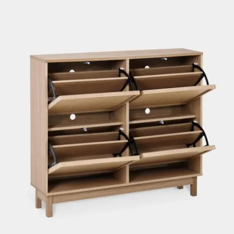 El zapatero doble Bora, confeccionado en madera color natural y fibra natural, es la opción perfecta para aquellos que buscan una solución de almacenamiento de calzado amplia y elegante. Su diseño robusto y estilizado cuenta con cuatro puertas abatibles, ofreciendo un amplio espacio para organizar hasta 24 pares de zapatos. Cada compartimento incluye separadores ajustables y extraíbles, lo que permite guardar tanto zapatos de tamaño estándar como calzado de mayor volumen. Completa tu hogar con los demás muebles de la colección Bora y crea un ambiente armonioso y lleno de estilo. Para garantizar su estabilidad y seguridad, es imprescindible fijarlo a la pared.