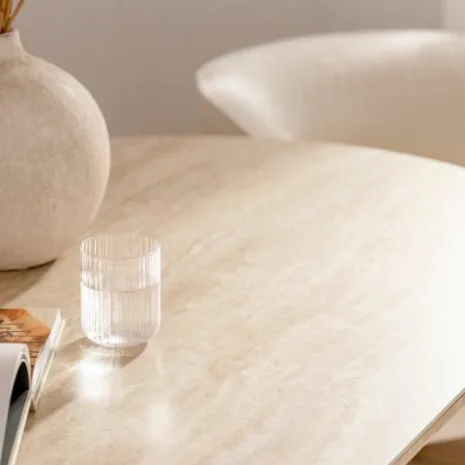 Eleva tu comedor con la mesa ovalada Calizia, elaborada en cerámica efecto travertino. Su forma ovalada aporta fluidez y elegancia al espacio, mientras que su textura añade carácter y distinción. Gracias a su diseño moderno se adapta perfectamente a diferentes estilos decorativos, creando un ambiente lleno de personalidad. Con capacidad para hasta 8 comensales, es ideal para reuniones familiares y cenas especiales con amigos.