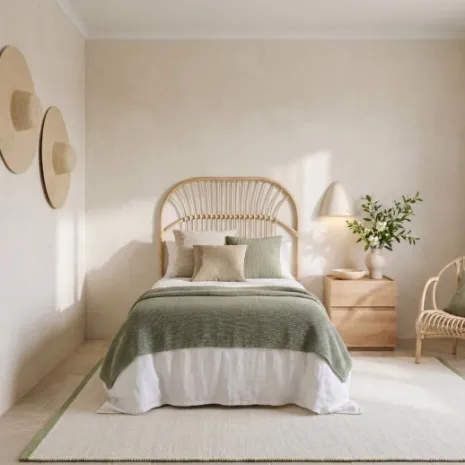 Dale un toque natural y acogedor a tu dormitorio con el cabecero Doe. Está fabricado artesanalmente en ratán natural, garantizando una pieza única y llena de carácter. Su diseño aporta una textura sutil y un aspecto fresco a la estancia, ideal para crear un ambiente relajante en tu hogar. Este cabecero sirve para camas de 80 o 90 cm.