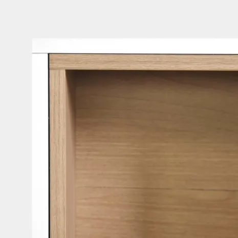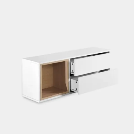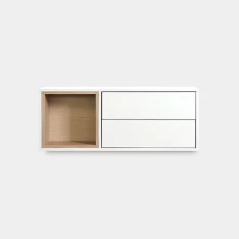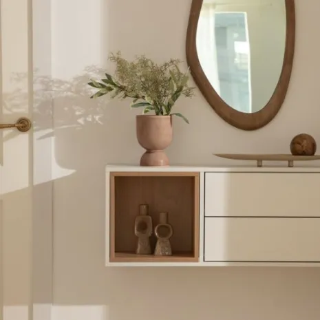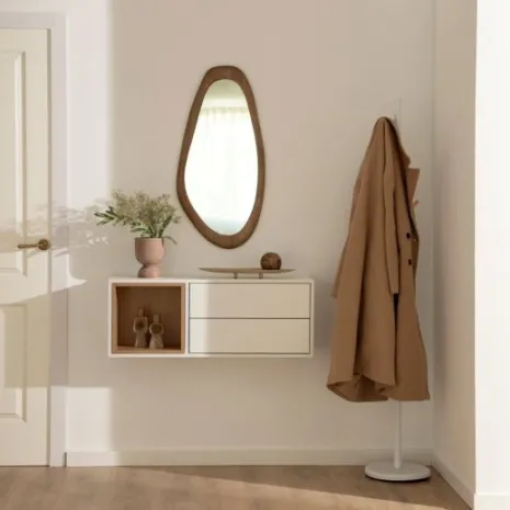 Transforma la entrada de tu hogar con el mueble recibidor flotante Hazan. Cuenta con dos cajones que permiten almacenar las llaves, el correo u otros objetos esenciales que necesites tener a mano al entrar o salir de casa. Además, cuenta con un hueco en madera color natural, que contrasta armoniosamente con el blanco, brindando un toque cálido y natural al espacio.
