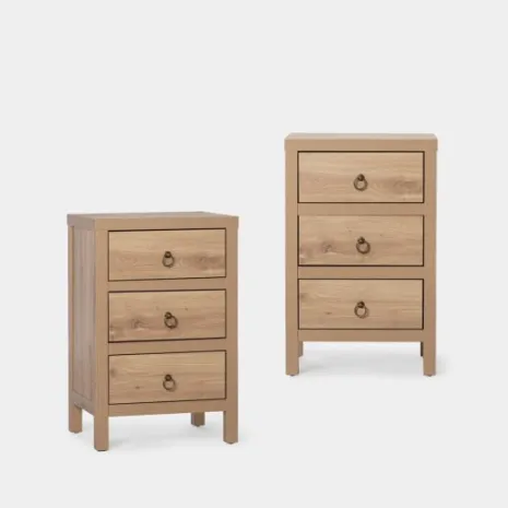 ¡Aprovéchate de este pack! La mesita de noche en madera color natural Livorno es ideal para crear un dormitorio cálido y acogedor. Sus tres amplios cajones, serán tus aliados para mantener tu espacio en orden. Combínala con otros muebles de la misma colección y consigue un look completo y armonioso en tu dormitorio.