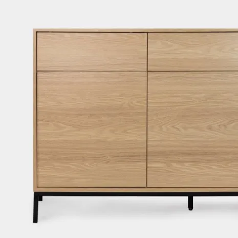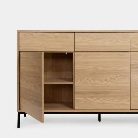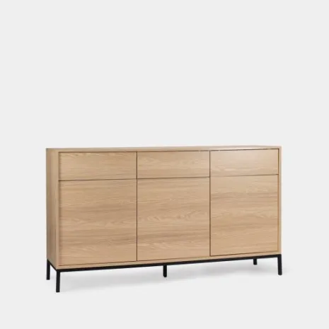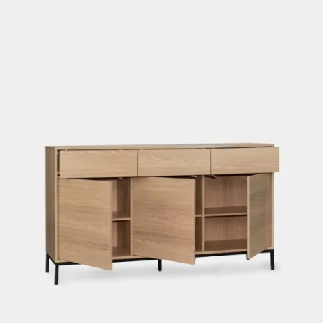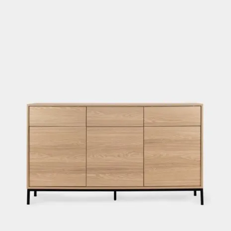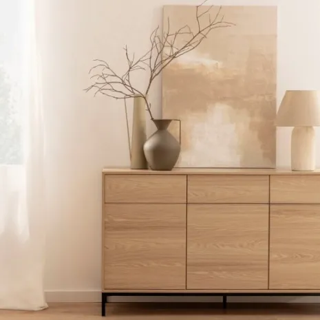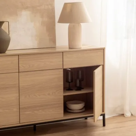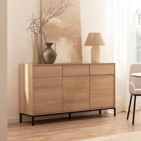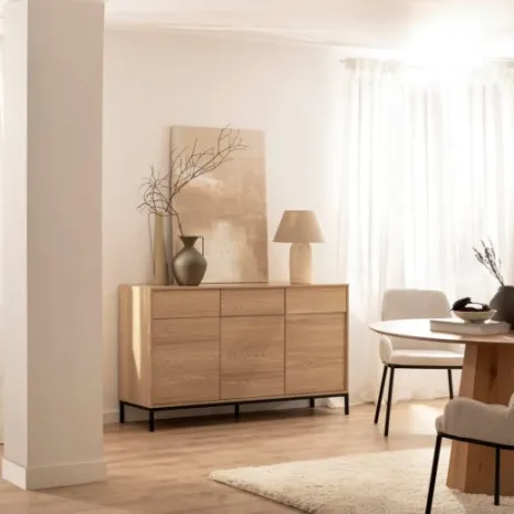 Añade elegancia y funcionalidad a tu salón con el aparador en madera color natural Remi. Sus tres puertas y tres cajones ofrecen amplio espacio de almacenamiento ideal para guardar vajilla, cristalería y otros objetos que desees mantener organizados y protegidos del polvo. Combínalo con otros muebles de la colección para lograr un look completo y armonioso en tu hogar.
