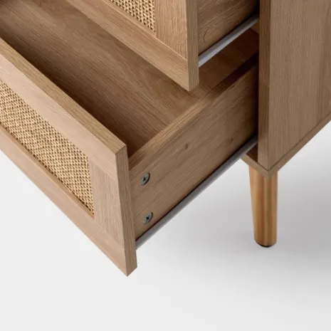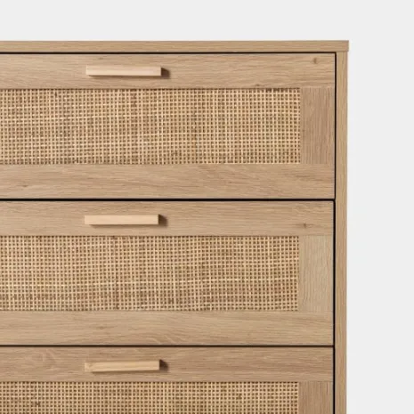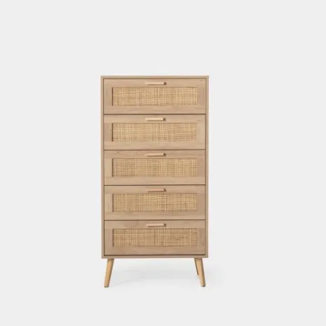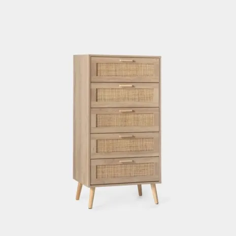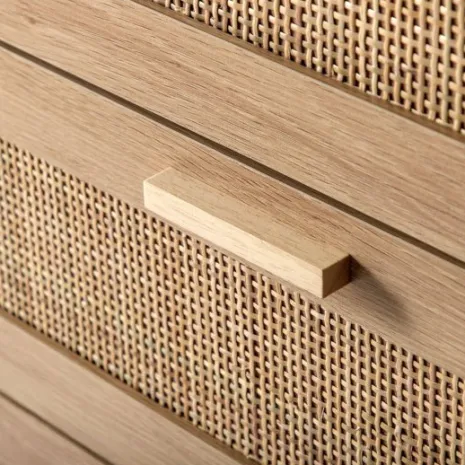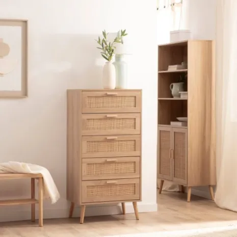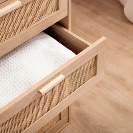 La cajonera en ratán natural Tahiti es el mueble perfecto para mantener en orden tu dormitorio. Gracias a sus 5 cajones de gran capacidad conseguirás aprovechar al máximo el espacio. Combínalo con los muebles de la misma colección y crea espacios llenos de encanto.