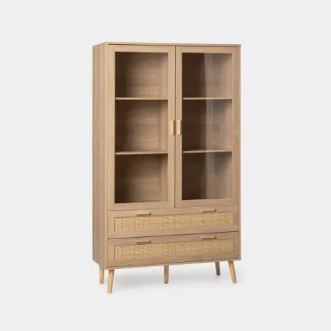 Transforma tu hogar con la vitrina en ratán natural Tahiti. Esta pieza no solo añadirá un toque acogedor y natural a tu hogar, sino que también ofrece funcionalidad. Cuenta con dos puertas acristaladas y tres estantes en los que podrás exhibir con estilo tu vajilla y cristalería favoritas. Además, sus dos cajones inferiores te brindan espacio extra para almacenar el menaje del hogar. ¡Haz que tu decoración destaque combinando esta vitrina con el resto de muebles de la colección y crea un efecto wow en tu hogar!