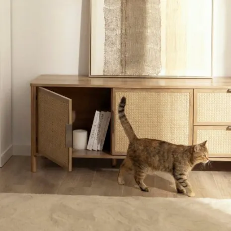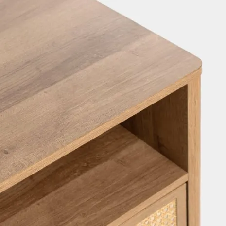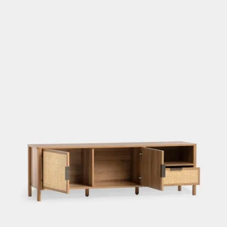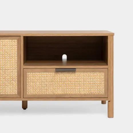 Eleva el estilo de tu salón con el mueble TV 160 Bent, que fusiona un acabado en madera natural con distintivos detalles de ratán natural. Su combinación de texturas aporta calidez y estilo orgánico mientras organiza tus dispositivos electrónicos y elementos multimedia de manera práctica y accesible. Dispone de dos puertas, un cajón y un estante con agujero pasacables, para que almacenes todos tus accesorios tecnológicos. Completa el look con el resto de la colección Bent y consigue un ambiente natural y contemporáneo para tu hogar.