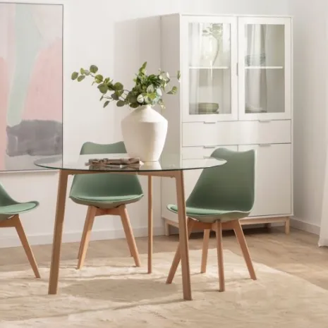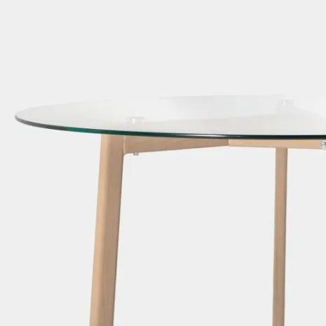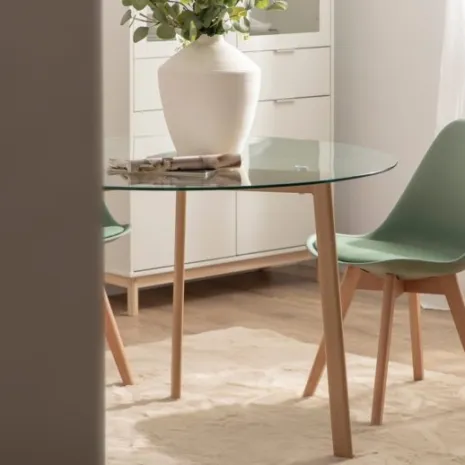 Dale un toque moderno y acogedor a tu hogar con la mesa de comedor redonda Eyre. Su tablero de vidrio templado y sus patas con acabado natural ofrecen la combinación perfecta de resistencia y estilo. Su diseño aporta amplitud al espacio y es apta para hasta 5 comensales, perfecta para compartir momentos especiales con los tuyos. Combínala con el resto de la colección y crea un ambiente armonioso y elegante.
