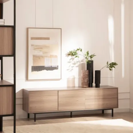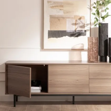 Eleva el estilo de tu salón con el mueble TV 160 en madera color natural Elton. Sus compartimentos cerrados permiten ocultar y almacenar todos los aparatos electrónicos necesarios para tu TV. Es ideal para conseguir un ambiente cálido y elegante en tu estancia.