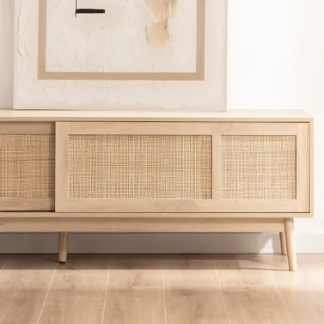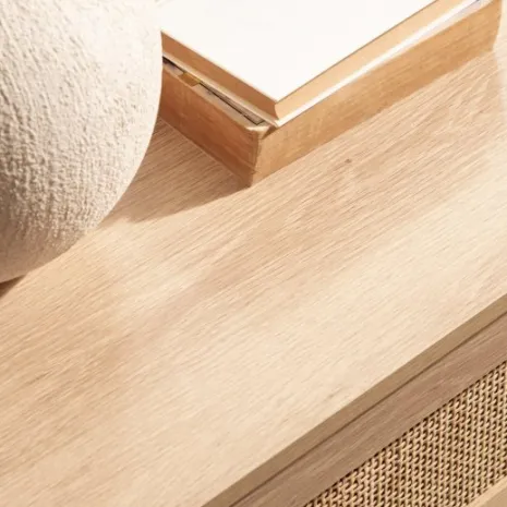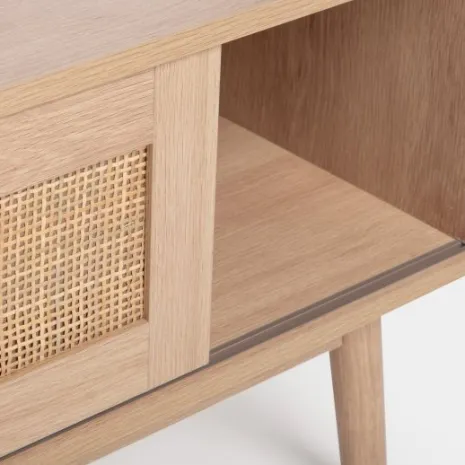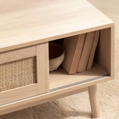 Con la mesa de centro Ikigai, acabada en madera y ratán natural, conseguirás un toque de calidez y estilo en tu hogar. Su diseño fusiona la serenidad del estilo escandinavo con la elegancia del minimalismo japonés, aportando un toque único a tu salón. Su sistema de puertas correderas permite optimizar el espacio de almacenamiento mientras mantienes ordenados libros, mandos y accesorios del día a día. Combínala con otros muebles de la colección para lograr un look completo y atemporal.
