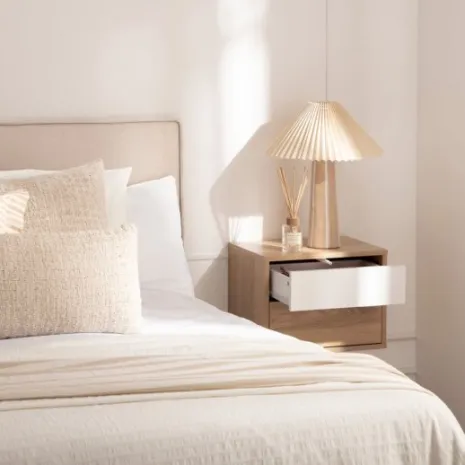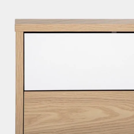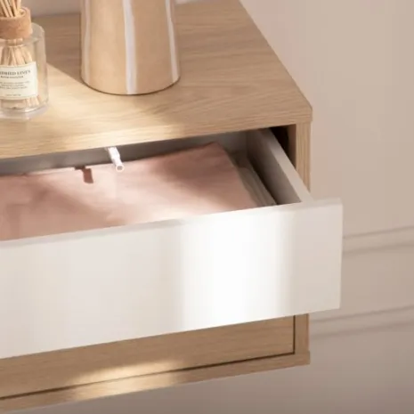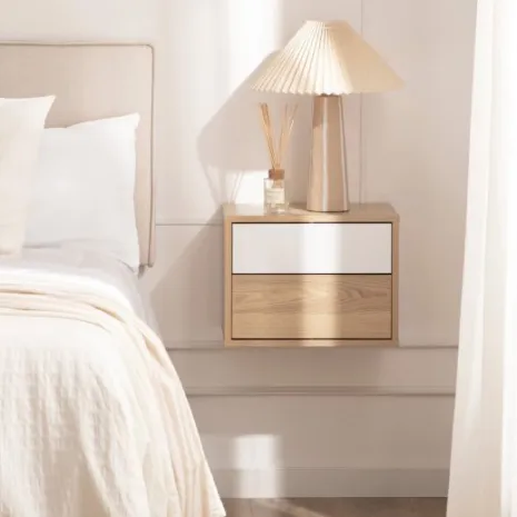¡Aprovéchate de este pack de 2 mesitas! La mesita de noche flotante Kayne combina funcionalidad y estilo en una pieza única. Acabada en madera natural y blanco, crea un contraste elegante que aporta personalidad a tu dormitorio. Sus dos cajones ofrecen espacio de almacenamiento práctico y discreto para tus objetos personales, mientras que su diseño flotante optimiza el espacio y aporta sensación de amplitud. Una solución perfecta si buscas un estilo contemporáneo y funcional para tu hogar.