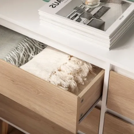 Con la cómoda de 6 cajones en madera color blanco y natural Kemi conseguirás crear un ambiente fresco y luminoso. Su diseño nórdico y sencillo convierte a esta cómoda en una apuesta segura para completar la decoración de tu dormitorio. Además, cuenta con 6 amplios cajones en los que podrás almacenar y organizar todas tus pertenencias.
