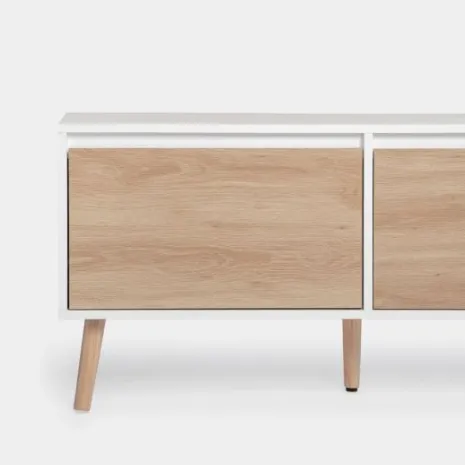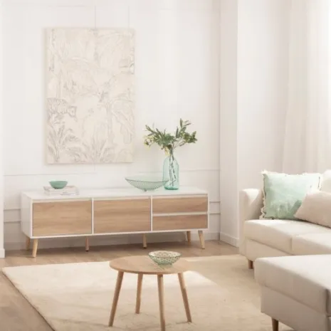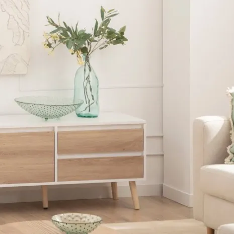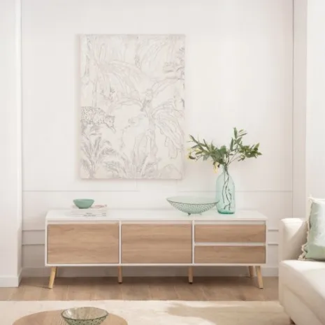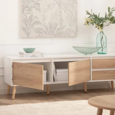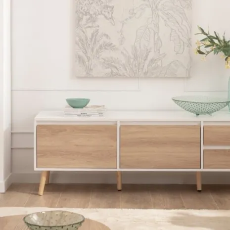 Dale un toque fresco y luminoso a tu hogar con el mueble TV 160 Kemi, acabado en madera color blanco y natural. Su diseño de estilo nórdico y líneas sencillas lo convierte en la opción ideal para crear un ambiente acogedor y armonioso en tu salón. Sus amplios compartimentos ofrecen el espacio perfecto para organizar todos tus dispositivos y accesorios manteniéndolos ocultos. Descubre el resto de la colección Kemi y consigue una decoración equilibrada y con estilo.