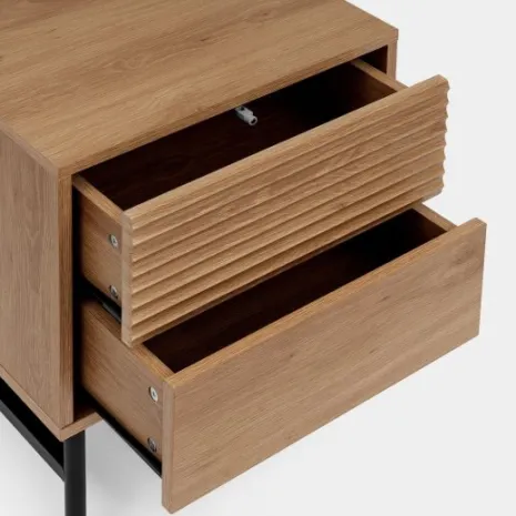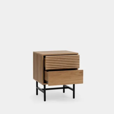 ¡Aprovéchate de este pack de 2 mesitas! Añade un toque único a tu dormitorio con la mesita de noche de 2 cajones Land. Su diseño combina la calidez del acabado en madera color natural con la solidez de las patas metálicas en color negro, creando un contraste moderno y elegante. Sus dos amplios cajones te ofrecen el espacio ideal para guardar tus objetos personales de forma discreta y mantener tus esenciales a mano. Descubre el resto de la colección Land y dale un nuevo aire a tu habitación.