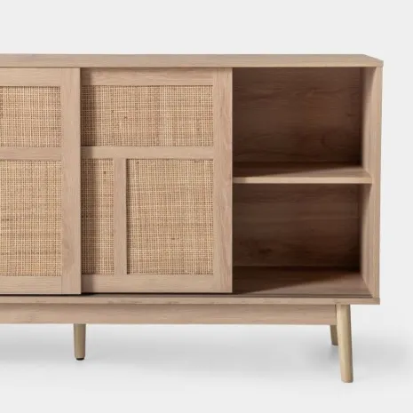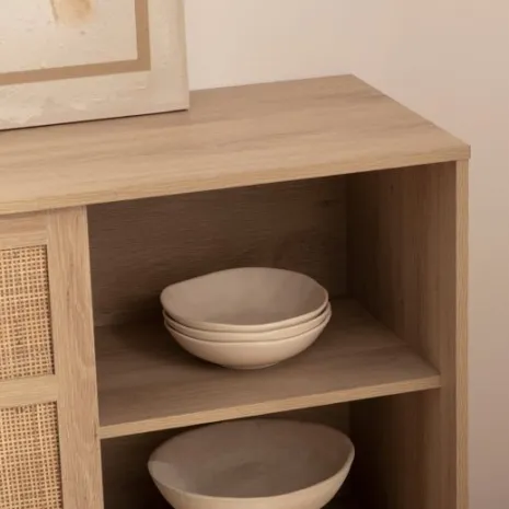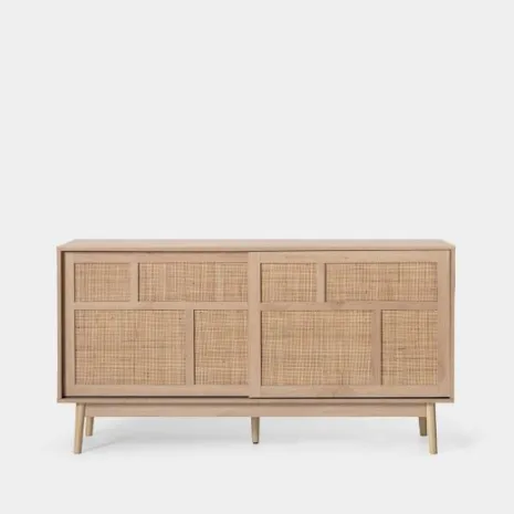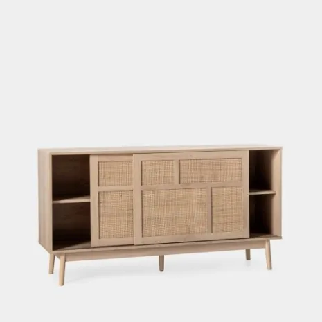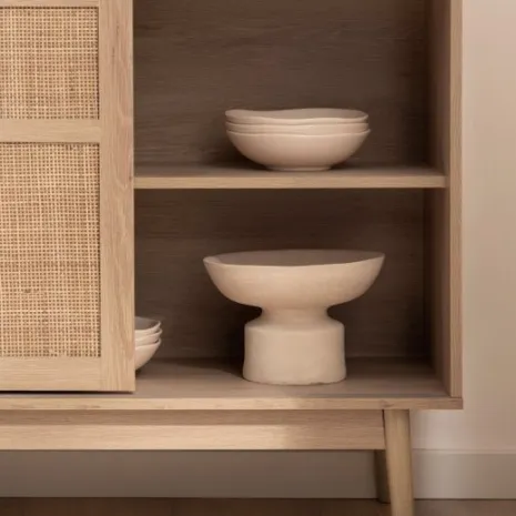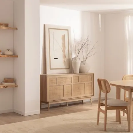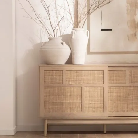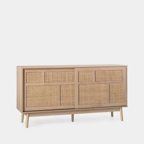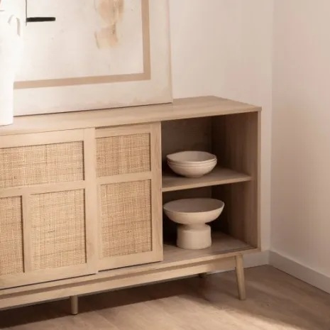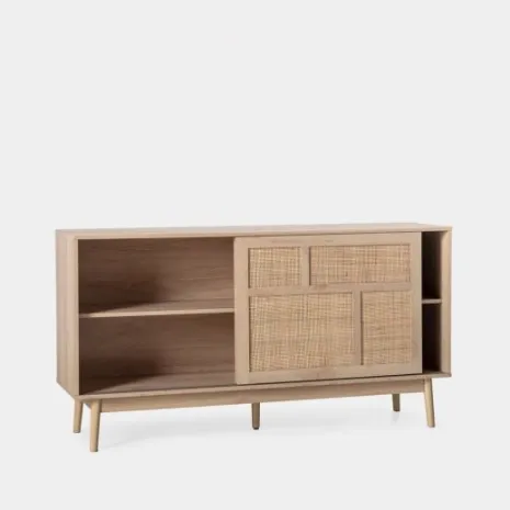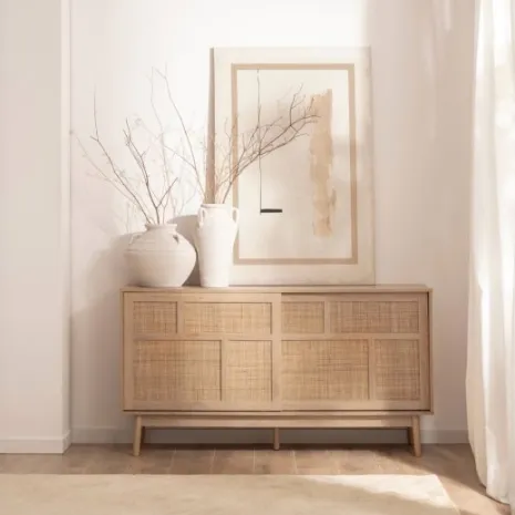 El aparador Ikigai fusiona la calidez del diseño escandinavo con la pureza del minimalismo japonés. Elaborado en madera de tono natural y ratán natural, presenta un acabado cálido y orgánico que realza cualquier ambiente. Su puerta corredera, práctica y estilizada, optimiza el espacio disponible mientras añade un toque contemporáneo. Una elección ideal para quienes valoran la armonía entre funcionalidad y diseño atemporal.