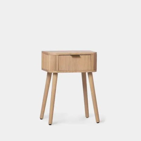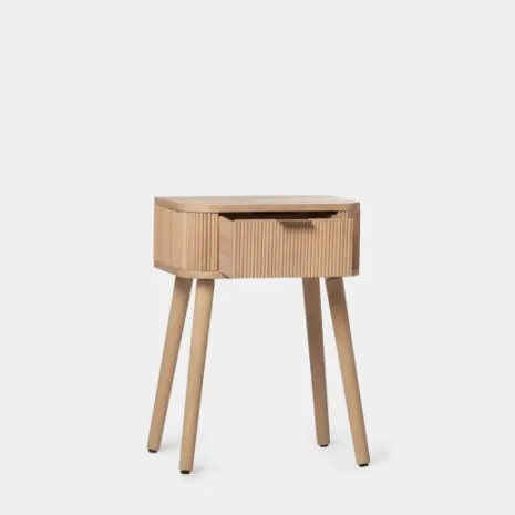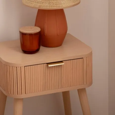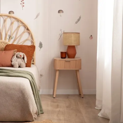 Transforma la habitación de tu peque en un espacio cálido y acogedor con la mesita de noche Mina, elaborada en chapa de pino y madera de roble. Cuenta con un amplio cajón donde podrá guardar sus cosas y mantener su cuarto siempre recogido.