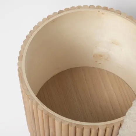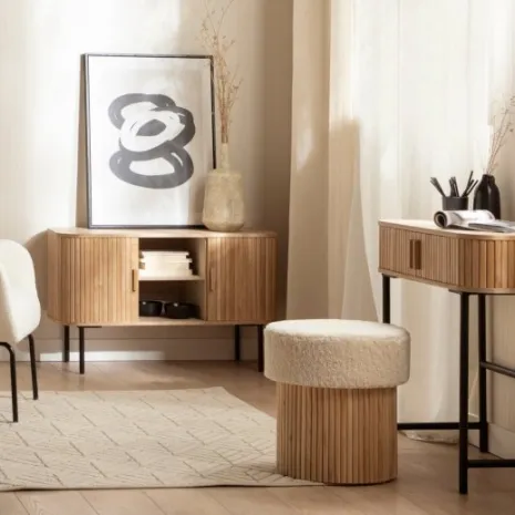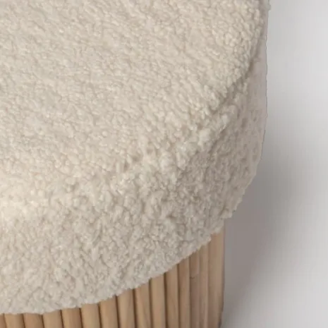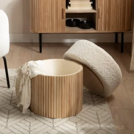 El puf redondo Naira, tapizado en borreguito blanco, es la opción ideal para darle el toque final a la decoración de tu hogar. Su diseño práctico incluye un espacio de almacenaje en su interior, ideal para guardar mantas, cojines y otros objetos, manteniéndolos organizados y fuera de la vista. Con Naira, fusiona estilo y funcionalidad para crear un ambiente acogedor y ordenado en tu hogar.