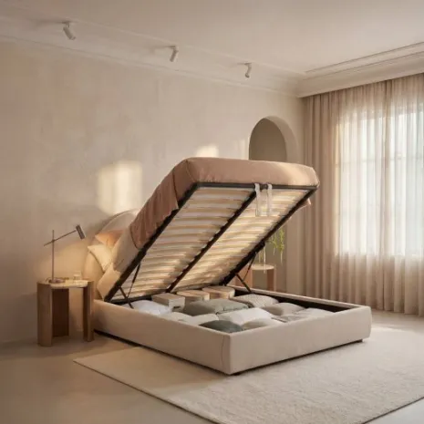 Transforma tu dormitorio con la cama con canapé abatible Selene. Su diseño de forma redondeada y el tapizado en color beige crean un ambiente acogedor que redefinirá tu zona de descanso. Pensada para la máxima funcionalidad, incorpora un práctico canapé con gran espacio de almacenaje para que puedas guardar todo lo que necesites. Además, el cabecero es desenfundable y lavable en frío, facilitando su mantenimiento y limpieza. Esta cama es apta para colchones de 160×200 cm.