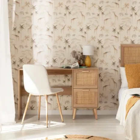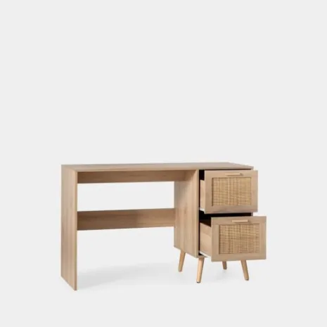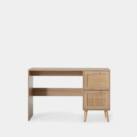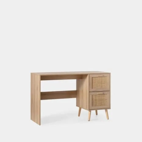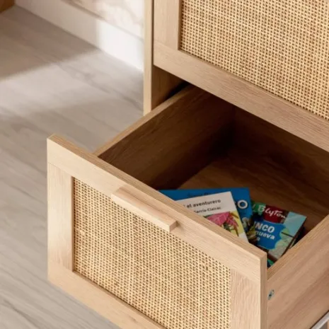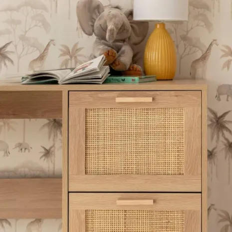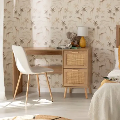 Crea un espacio de estudio perfecto para tu hijo con el escritorio Tahiti. Su diseño natural combinando madera y detalles en ratán aporta calidez y crea un ambiente relajado ideal para hacer los deberes, dibujar o desarrollar su creatividad. Sus dos amplios cajones le ofrecen espacio para guardar su material escolar y mantener todo bien organizado. Combínalo con los muebles de la misma colección y crea un espacio lleno de encanto que crecerá con él.