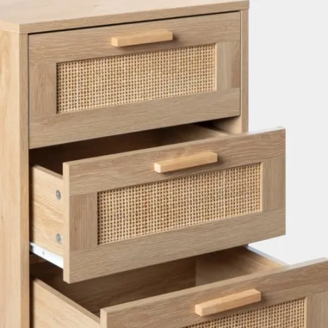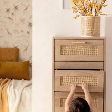 La cajonera en ratán natural Tahiti es el mueble perfecto para mantener ordenada la habitación de tu peque. Gracias a sus medidas contenidas y gran capacidad de almacenamiento aprovecharás al máximo el espacio disponible. Sus cinco cajones le permitirán tener toda su ropa bien organizada y siempre a mano. Combínala con los muebles de la misma colección y crea un espacio lleno de encanto que crecerá con él.