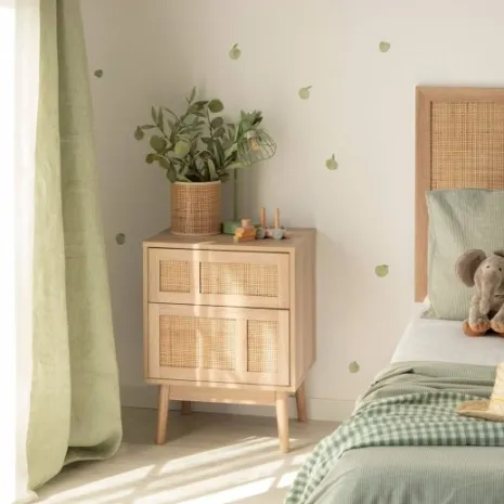 La mesita de noche Ikigai en madera y ratán natural será ideal para la habitación de tu hijo. Su estilo escandinavo con toques minimalistas crea un ambiente relajante y acogedor perfecto para su descanso. Sus dos cajones ofrecen espacio suficiente para guardar sus cuentos, juguetes y mantener su cuarto bien ordenado. Combínala con otros muebles de la colección para conseguir un look atemporal que lo acompañará en cada etapa.