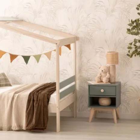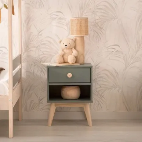Completa la habitación de tu pequeño con la mesita de noche infantil Luke. Su estilo nórdico en acabado verde antracita aporta un toque moderno y acogedor, perfecto para cualquier estilo de dormitorio. Cuenta con un cajón espacioso y un estante inferior, ideales para guardar sus cuentos, juguetes o todo lo que necesite tener a mano. Combínala con el resto de la colección para tener un espacio armonioso y encantador.