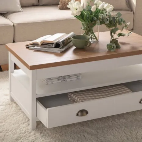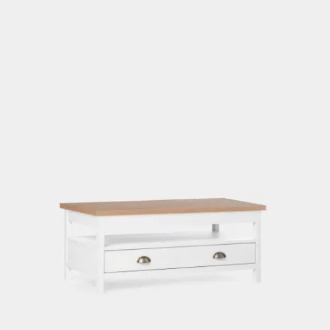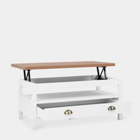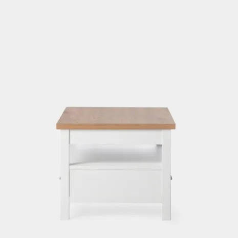 La mesa de centro elevable blanca Marais es la pieza ideal para completar tu salón/comedor. Se trata de una mesa práctica con la que podrás trabajar desde el sofá, estudiar o cenar en el salón cómodamente. Además, cuenta con un espacio de almacenaje superior y con un cajón que se desliza por ambas partes de la mesa para aumentar la comodidad a la hora de almacenar.