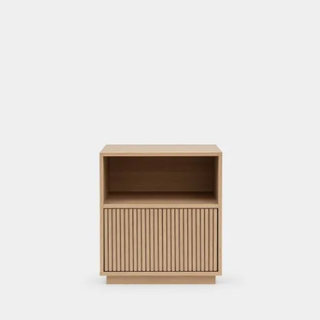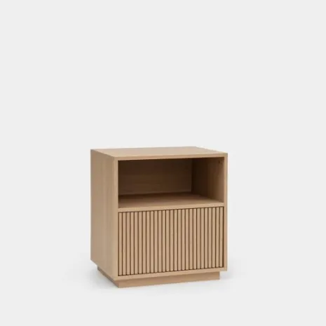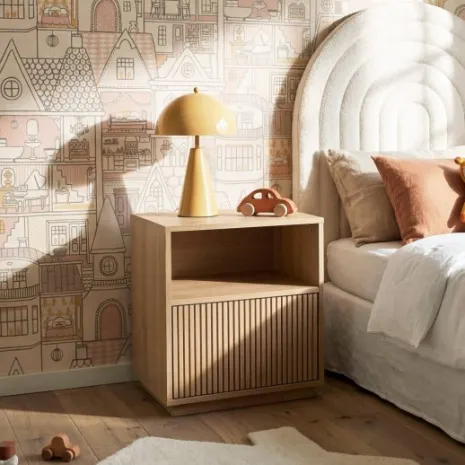 La mesita de noche Saven infantil es perfecta si buscas un mueble que aporte calidez y un toque mágico al dormitorio de los más pequeños. Su acabado en madera natural y los detalles del frontal crean una textura acogedora y segura. Su diseño combina un práctico hueco abierto para tener sus cuentos favoritos siempre a mano, y un amplio cajón inferior para que guarden sus pertenencias de forma ordenada. Descubre el resto de la colección Saven y crea un ambiente lleno de estilo y ternura en su cuarto.