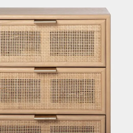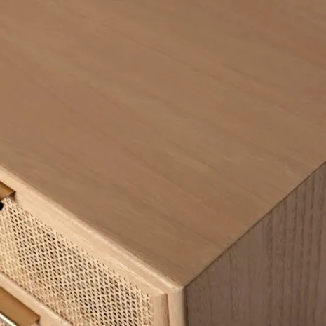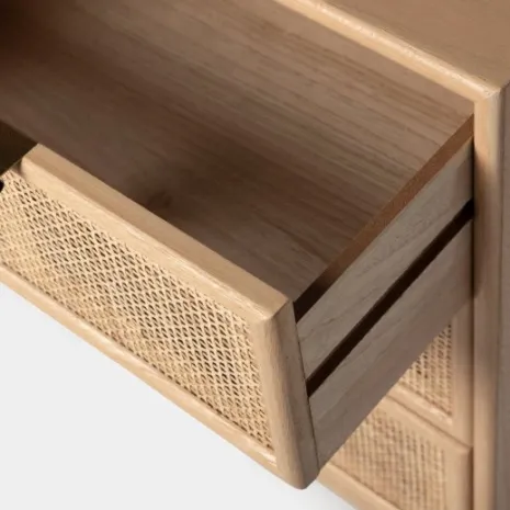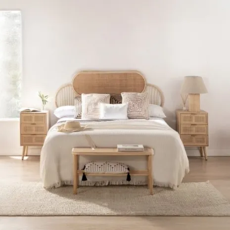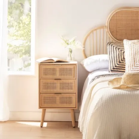 ¡Aprovéchate de este pack! Transforma tu dormitorio en un oasis de calma y estilo con la mesita de noche Alis, elaborada en chapa de paulownia y ratán natural. Sus tres amplios cajones ofrecen una solución práctica para mantener tus pertenencias ordenadas y al alcance.