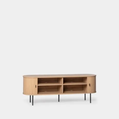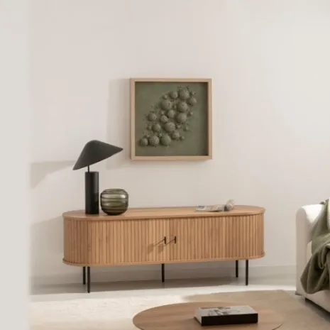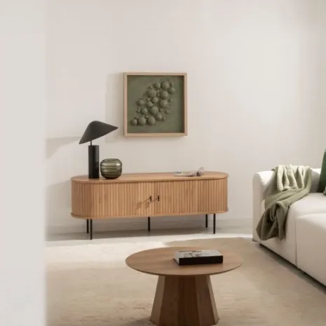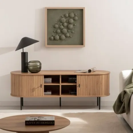 Aporta un toque moderno a tu salón con el mueble TV 150 en madera color natural Breda. Su diseño redondeado y sus dos puertas correderas de estilo persiana no solo añaden un toque distintivo, sino que también ofrecen un amplio espacio de almacenamiento. Combínalo con el aparador Breda para lograr un look completo en el que la funcionalidad y el estilo se fusionan armoniosamente.
